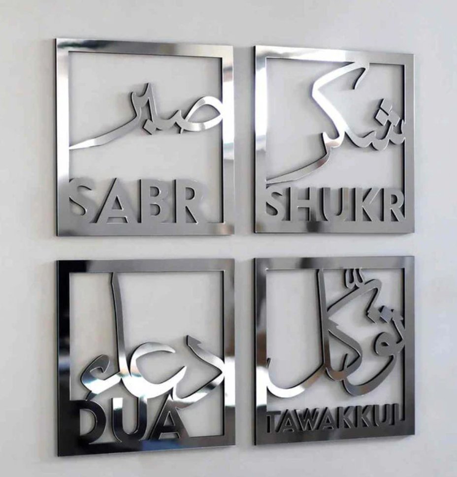 L’ ensemble d’art mural islamique Sabr Shukr Dua Tawakkul (20×25cm) rassemble quatre valeurs spirituelles fondamentales dans une élégante calligraphie arabe, alliant la foi à un design moderne et réfléchissant pour sublimer n’importe quel espace.